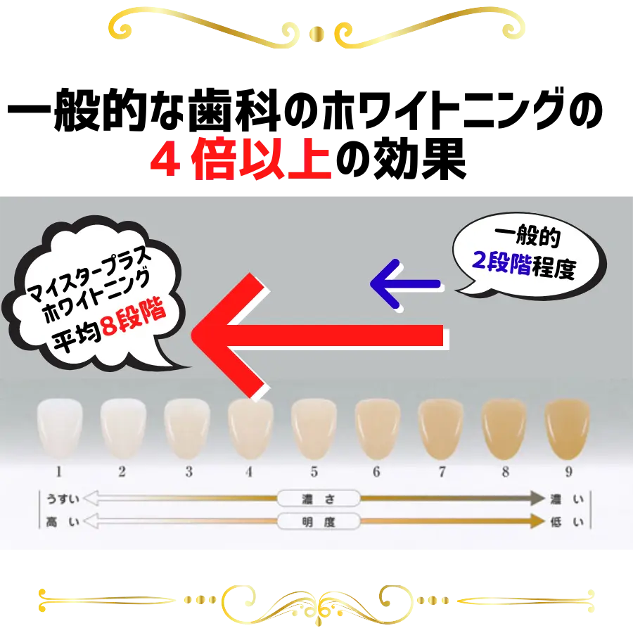 ホワイトニングは、どのシステムでも多少の個人差は出るため、当院のようにアメリカの強力なホワイトニングシステムを使用したとしても必ず一回で白くなると言い切ることはできません。しかし、当院での1万人以上の施術を通しての目安として、平均8段階程白くなる方が多いので多くの皆さまに満足頂いています。また、マイスタープラスホワイトニングには『白さ保証』制度もあるのでご安心下さい。